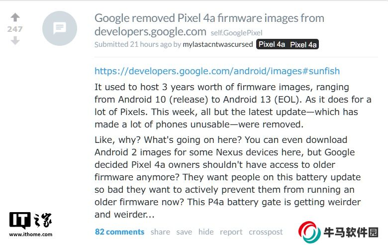 Pixel 用戶似乎將面臨更多麻煩。一位 Reddit 用戶發(fā)現(xiàn),谷歌已刪除了 Pixel 4a 的所有固件版本,而這一行為顯得極為反常。