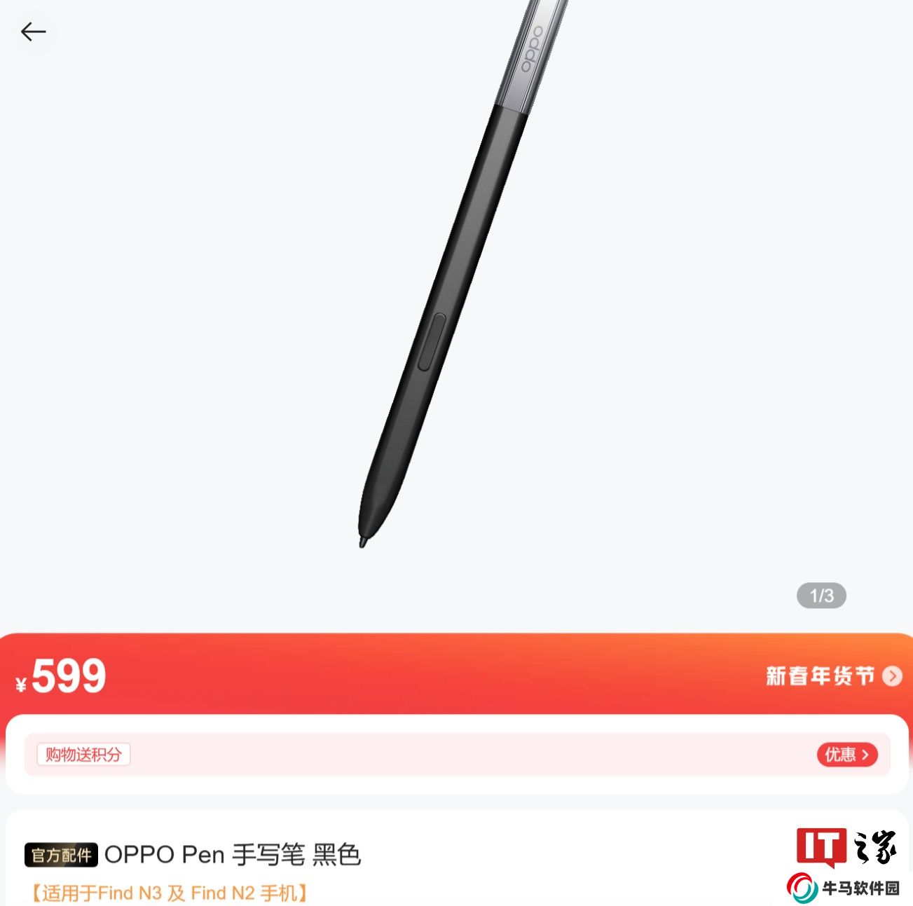 目前 OPPO 官網(wǎng)在售有黑色款 OPPO Pen 手寫筆,定價 599 元,適配 FInd N3 和 Find N2 折疊屏手機。
