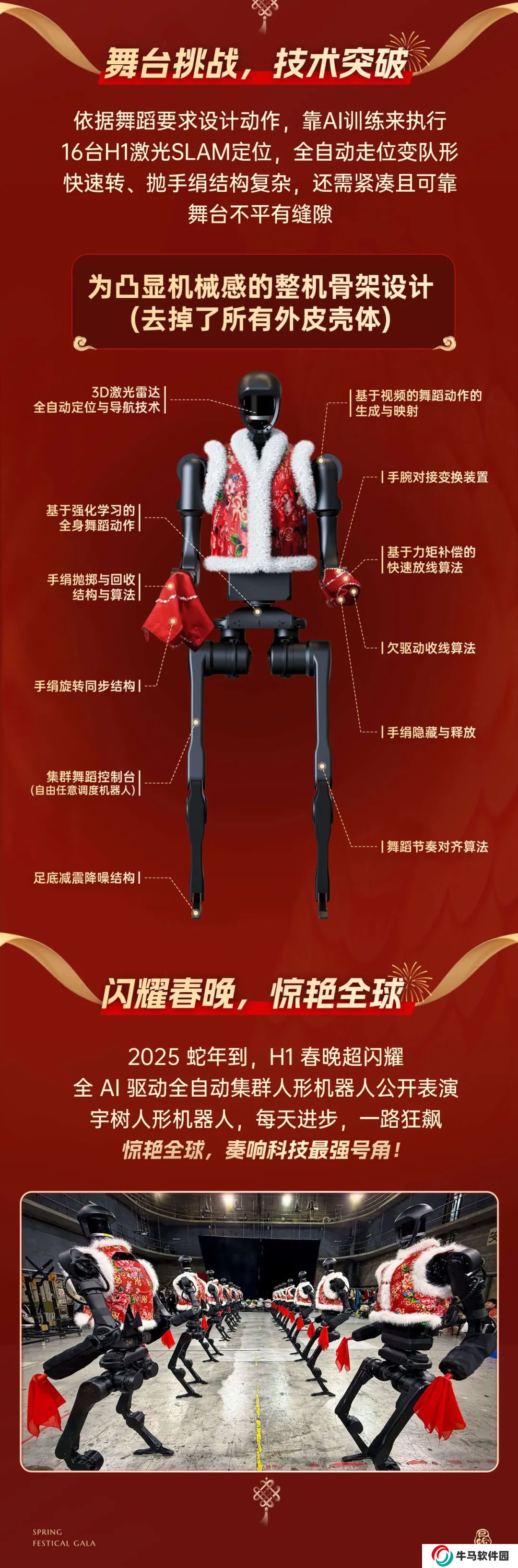 此外,為凸顯機械感的整機骨架設計,春晚舞臺上的 Unitree H1去掉了所有外皮殼體。
