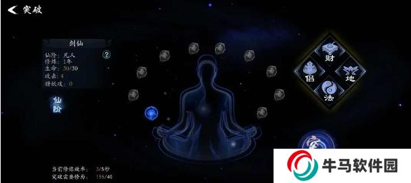 在吸取完靈氣后我們左上角人物頭像會(huì)出現(xiàn)討厭的小紅點(diǎn),這是說明修為可以突破到下一仙階了,點(diǎn)擊之后會(huì)進(jìn)入下面的界面,點(diǎn)擊突破就可以從凡人踏入修仙者的行列了。