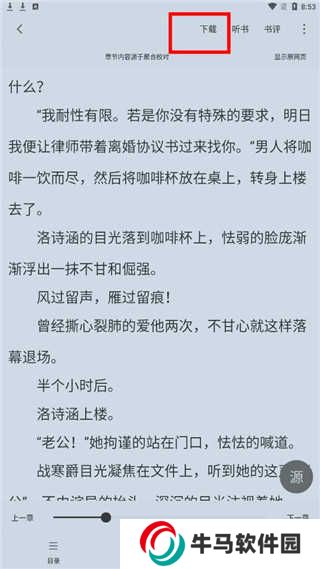 4、在閱讀界面,我們需要點(diǎn)擊一下屏幕中央,這時候在屏幕的上方便會出現(xiàn)一個功能列表,在列表中就可以找到下載的按鈕了。